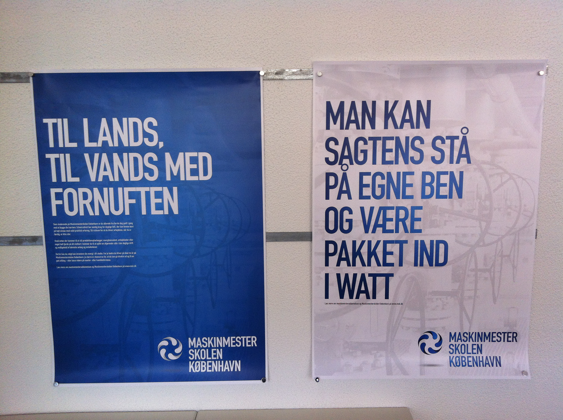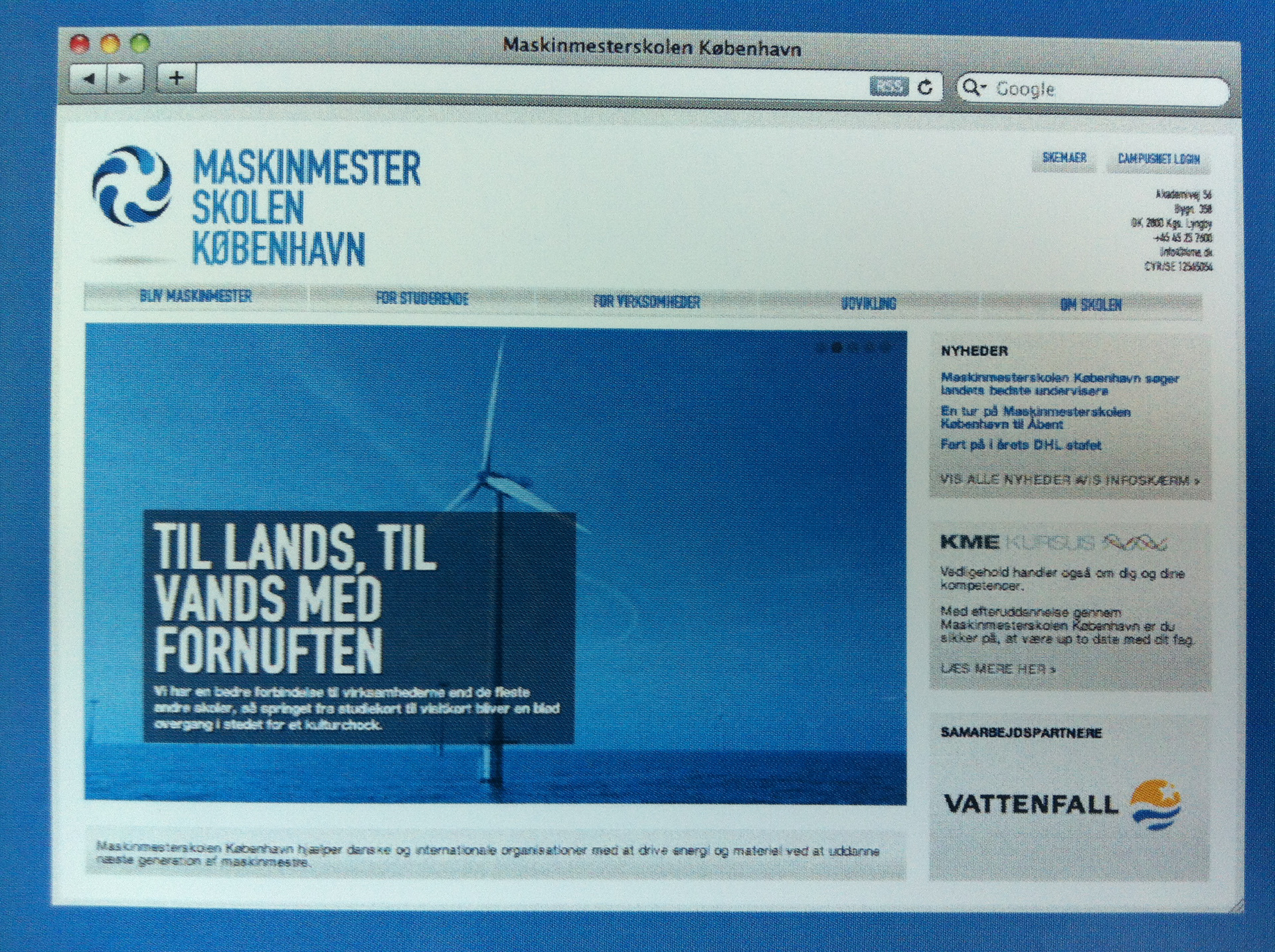 Maskinmesterskolen København har siden 1920 udbudt udfordrende, erhvervsorienterede og spændende uddannelser. Skolen har ligget forskellige steder og haft forskellige navne, så i 2012 var der behov for en kommunikérbar identitet, der var lige så stærk som skolens historie. Københavns Maskinmesterkskole blev til Maskinmesterskolen København, og selvom platformen indeholder nyt logo, ny web og en mere ung profil, er forbindelsen til tandhjul, sværindustri og maritim ingeniørkunst til at tage at føle på.